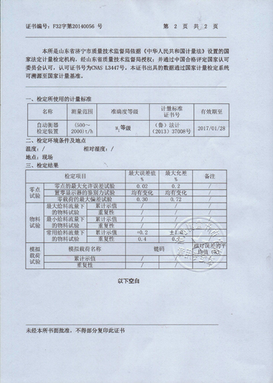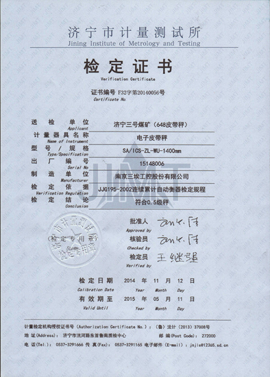 下附:山東省濟寧市測試所的檢定證書