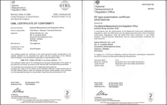 0.2級皮帶秤OIML標準認證和歐盟EC認證