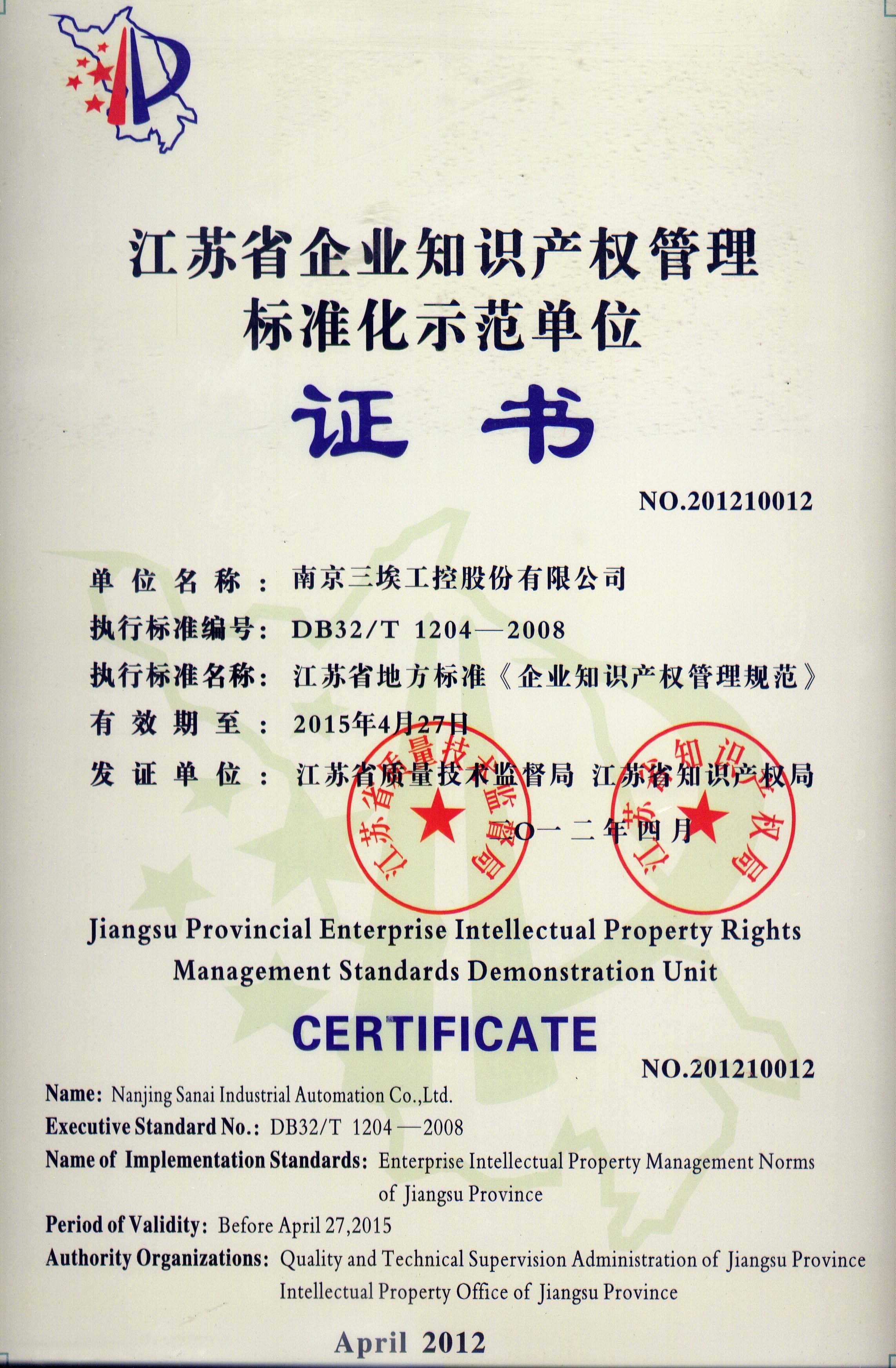我公司獲得省知識產權產權管理標準化單位證書