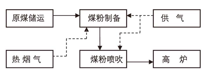 高爐噴煤就是把原煤(無煙煤、煙煤)經過烘干、磨細、收集,然后用壓縮空氣(或氮氣)輸送,通過噴煤槍從高爐風口直接噴入爐缸的生產工藝。高爐噴煤系統的工藝流程主要由原煤貯運、